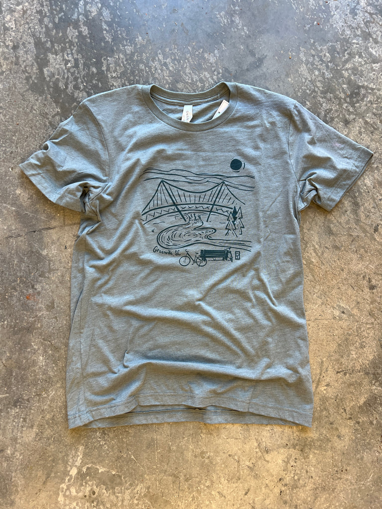 Get a soft, lightweight Olive tee featuring a block print illustration of Greenville's Liberty bridge, Reedy River and bike scene inspired by Greenville, SC. Wear this with pride and have the newest Greenville apparel.